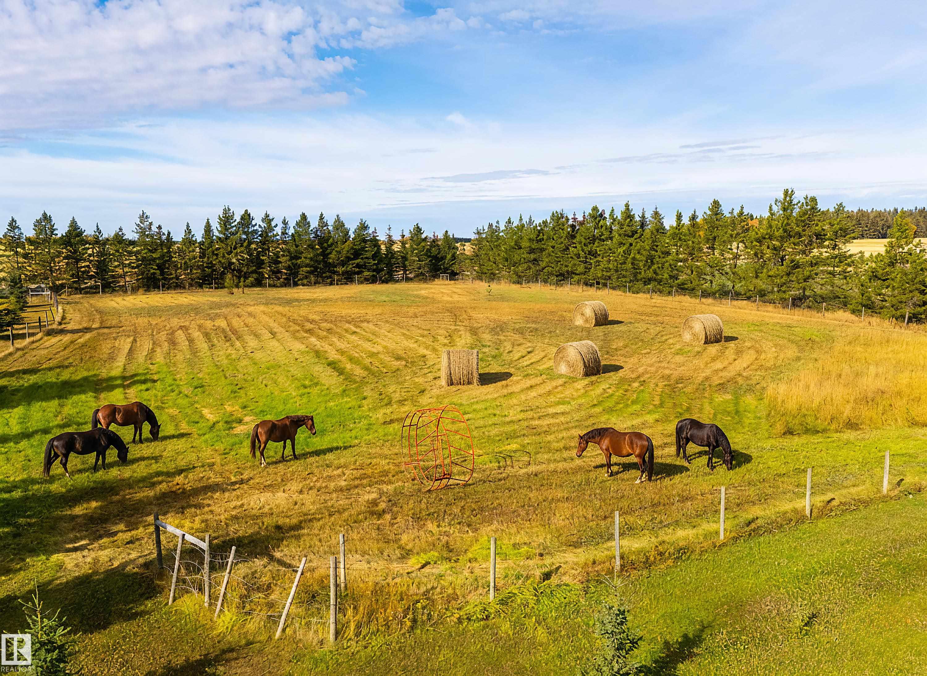 You own 80-acres in Leduc County offering true country living with endless potential. Just 1 km south of Glen Park Rd, this 2,700 sq ft bi-level home has been lovingly maintained by the original owner and features 4 bedrooms, 2.5 baths, a spacious main-level living area, and a large, well-equipped kitchen perfect for family gatherings. The finished basement includes a cozy wood stove, additional living space, and flexible rooms for office or recreation. An oversized double attached heated garage adds year-round convenience. The property includes two fenced pastures, a pen with chute, multiple outbuildings including a workshop, gardens, fruit trees, and a huge 40-ft-deep fenced dugout. Two 20'x60' greenhouses with attached work area and storefront (heated, powered, plumbed) are ready for growing, storage, or creative business ventures. Long-term farmland rental offsets property taxes. Shingles in 2025. Enjoy peaceful prairie views, mature trees, and spectacular sunsets--all just minutes from Leduc.