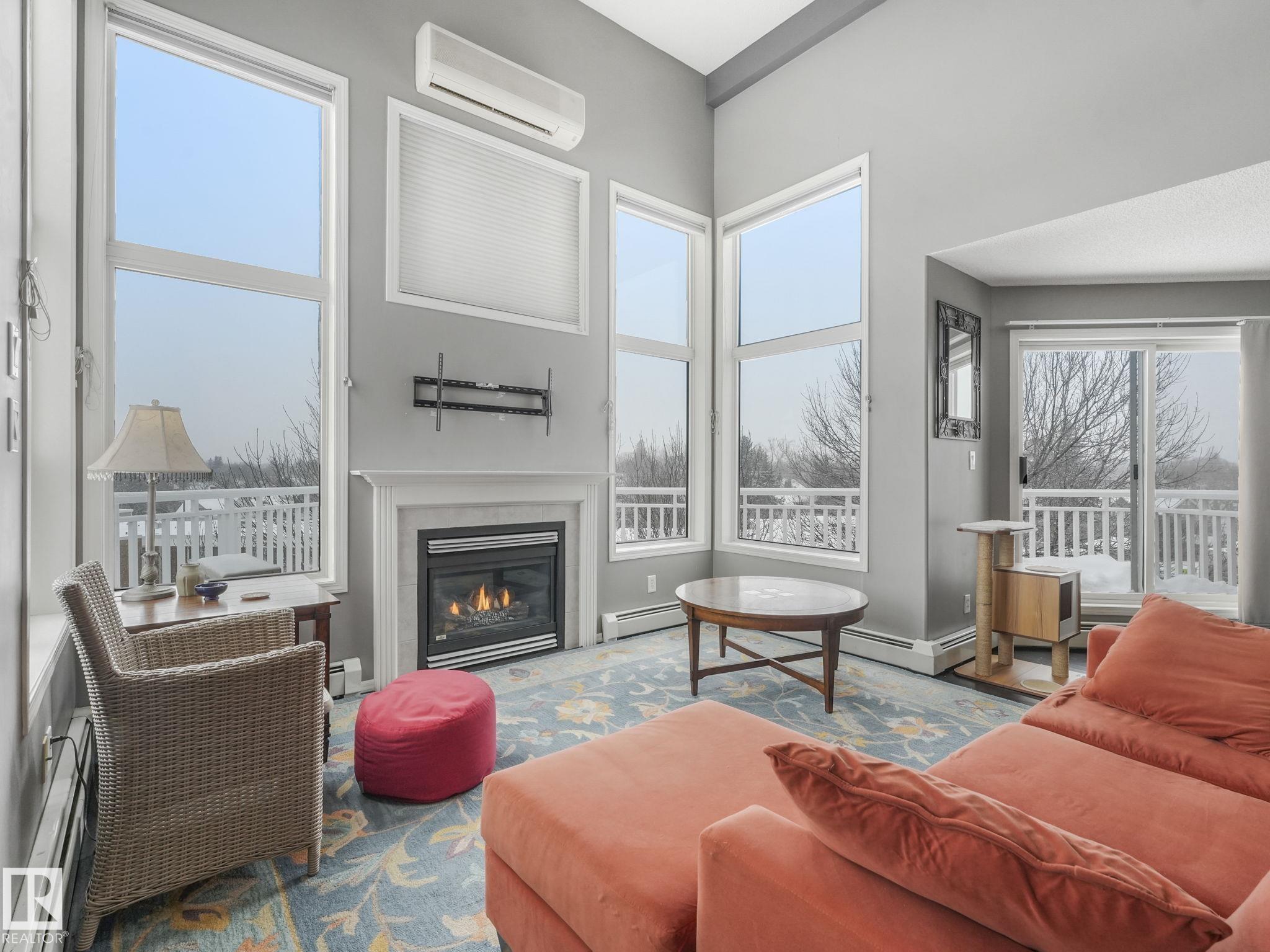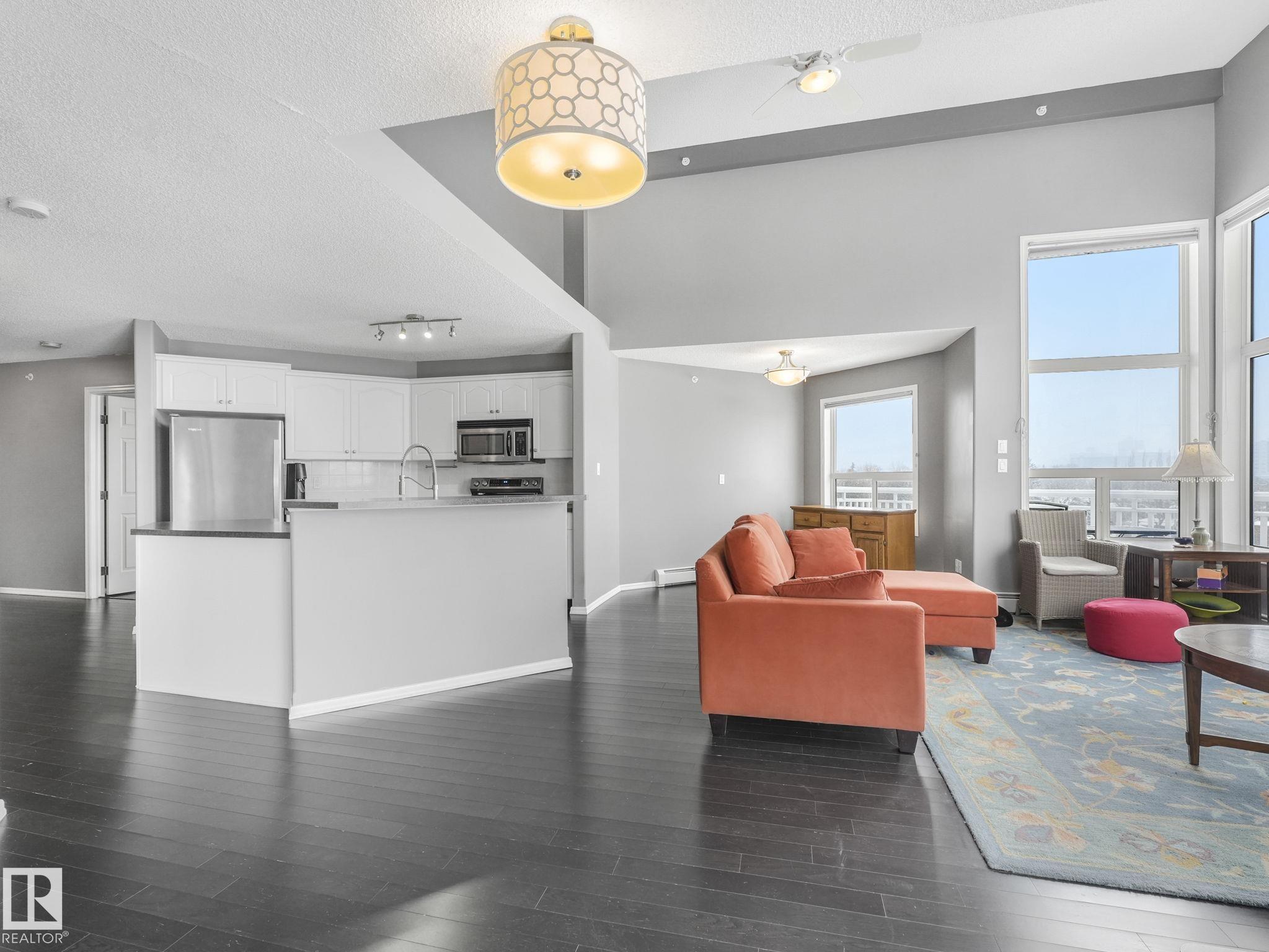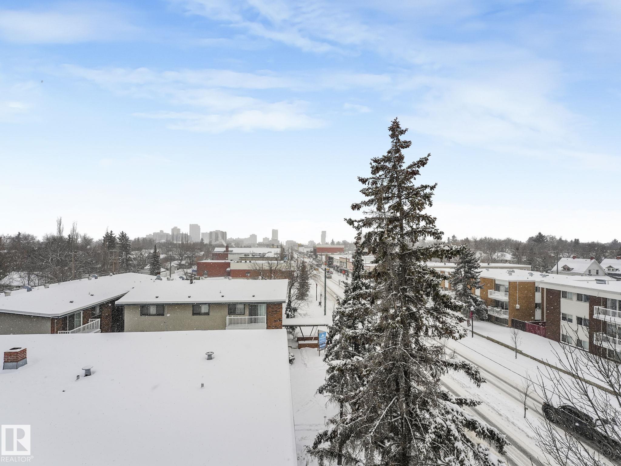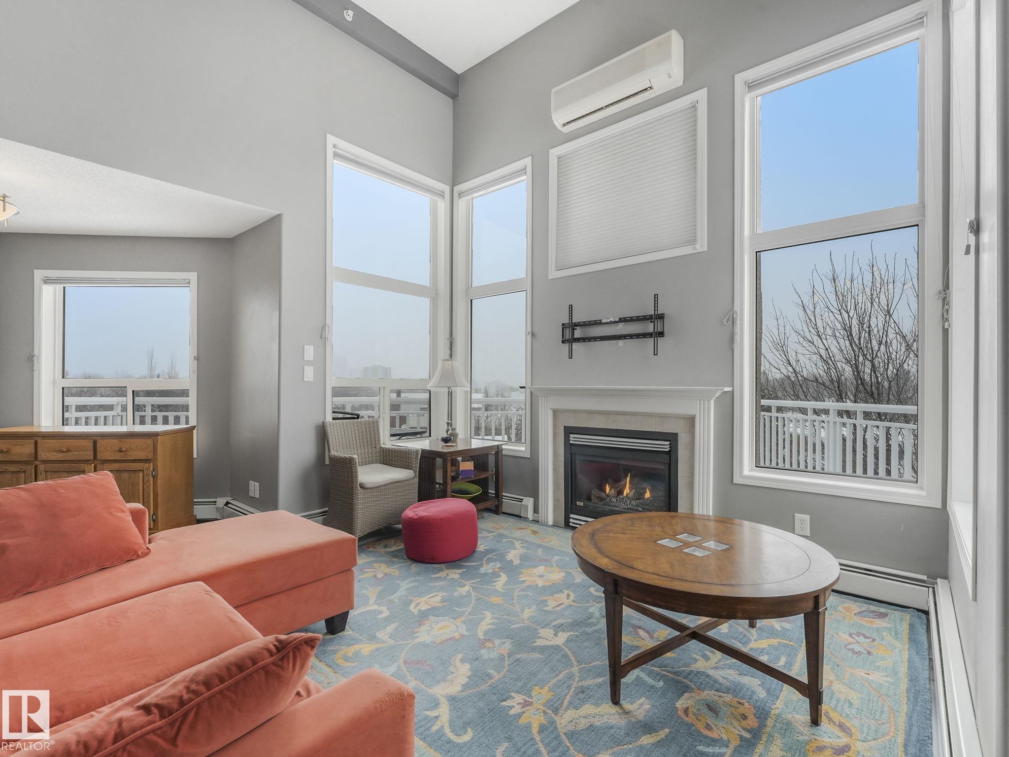 MODERN, BRIGHT, 14' CEILINGS, CORNER PENTHOUSE in St. Lawrence Court in sought-after Westmount. Enjoy over 1000+ square feet in this top floor, 2 bedroom, 2 bathroom condo with open living area, 14' ceilings, great views, gorgeous SW exposure, tons of natural light and air conditioning. Dark floors throughout, mostly NEW stainless steel appliances, fireplace, and in-suite laundry are just a few more features. Take the party outside on the massive wrap around balcony with city views and then relax in one of two spacious bedrooms. The unit also comes with 2 titled underground parking stalls & storage cage. Amenities include the gated, courtyard, social room, fitness rooms & secured underground parking with car wash. Pet friendly building, max 2 animals per unit with board approval. No size limits! Is Centrally located on 124 St, walk to Tiramisu, the Westmount Farmers Market, The Viking, art galleries, right beside Massage, Chiropractor, Physiotherapy, Acupuncture and more! Enjoy an upscale, walkable lifest