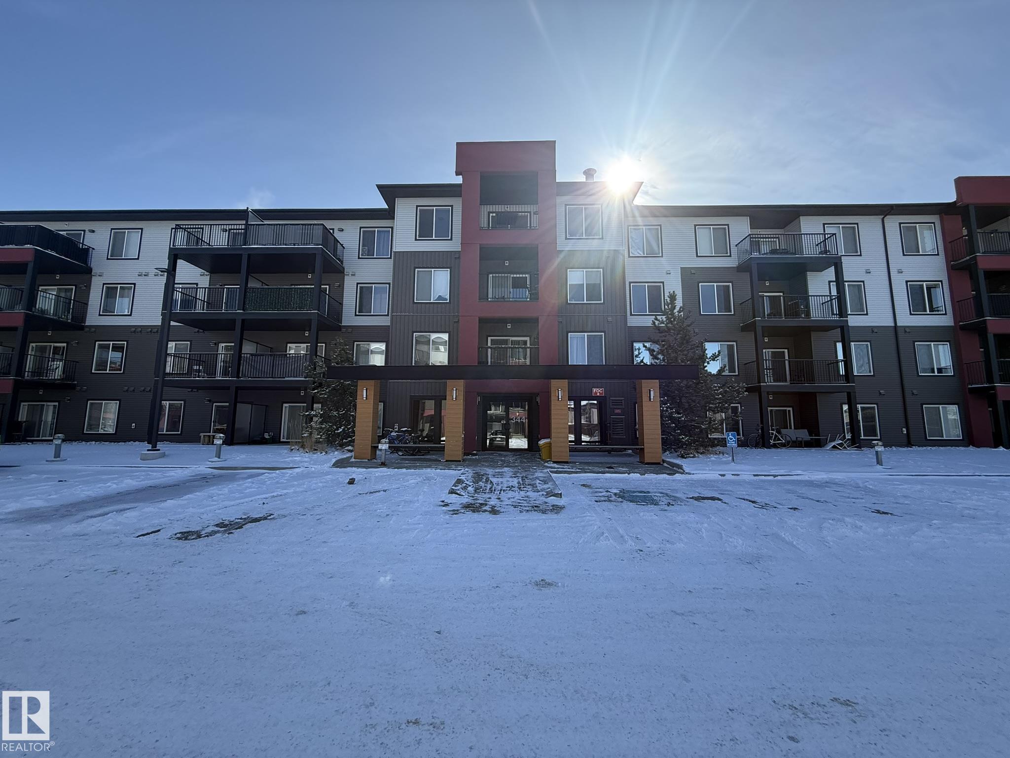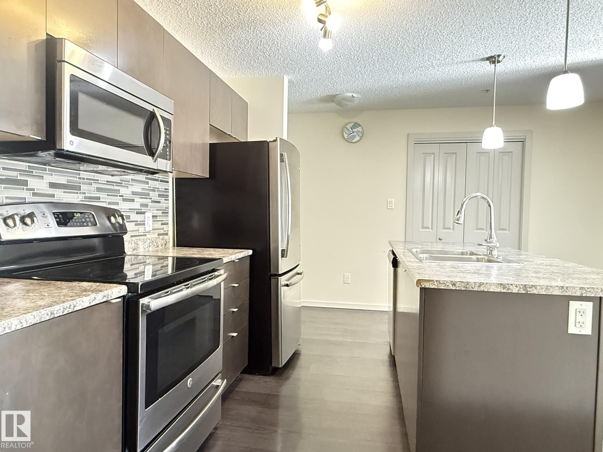 2 bedroom, 2 bathroom END UNIT on main floor with WRAP AROUND PATIO! Nice open living space with large island bar, SS appliances and pantry. Good sized bedrooms, primary has corner window, massive walk through closet with natural light and 4 piece bathroom. Laundry room has stackable washer/dryer and extra storage. This unit comes with 2 TITLED PARKING STALLS!-1 underground and 1 surface stall. This condo is in a great location, walking distance to shopping, dining, theatre, schools, playground, transit