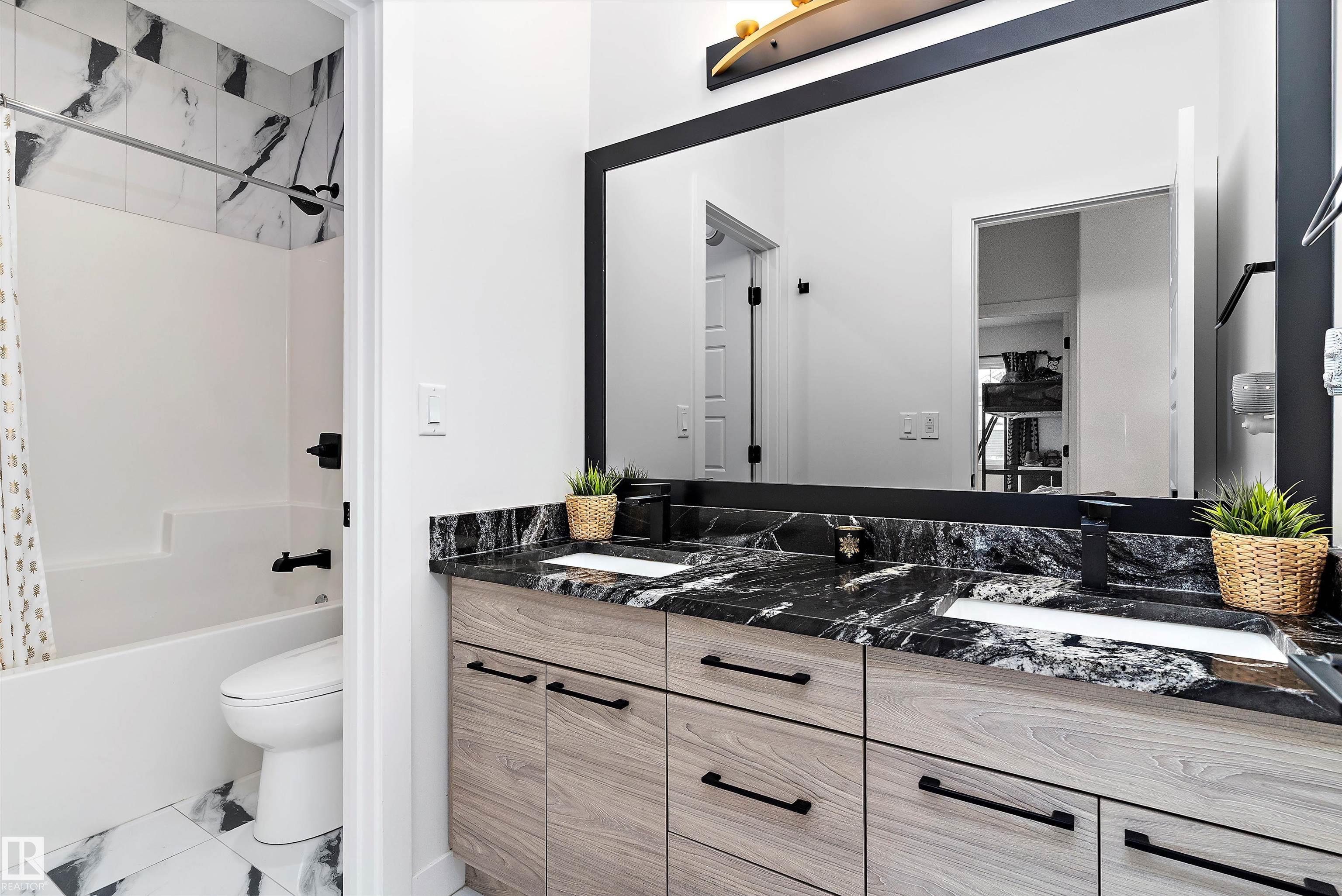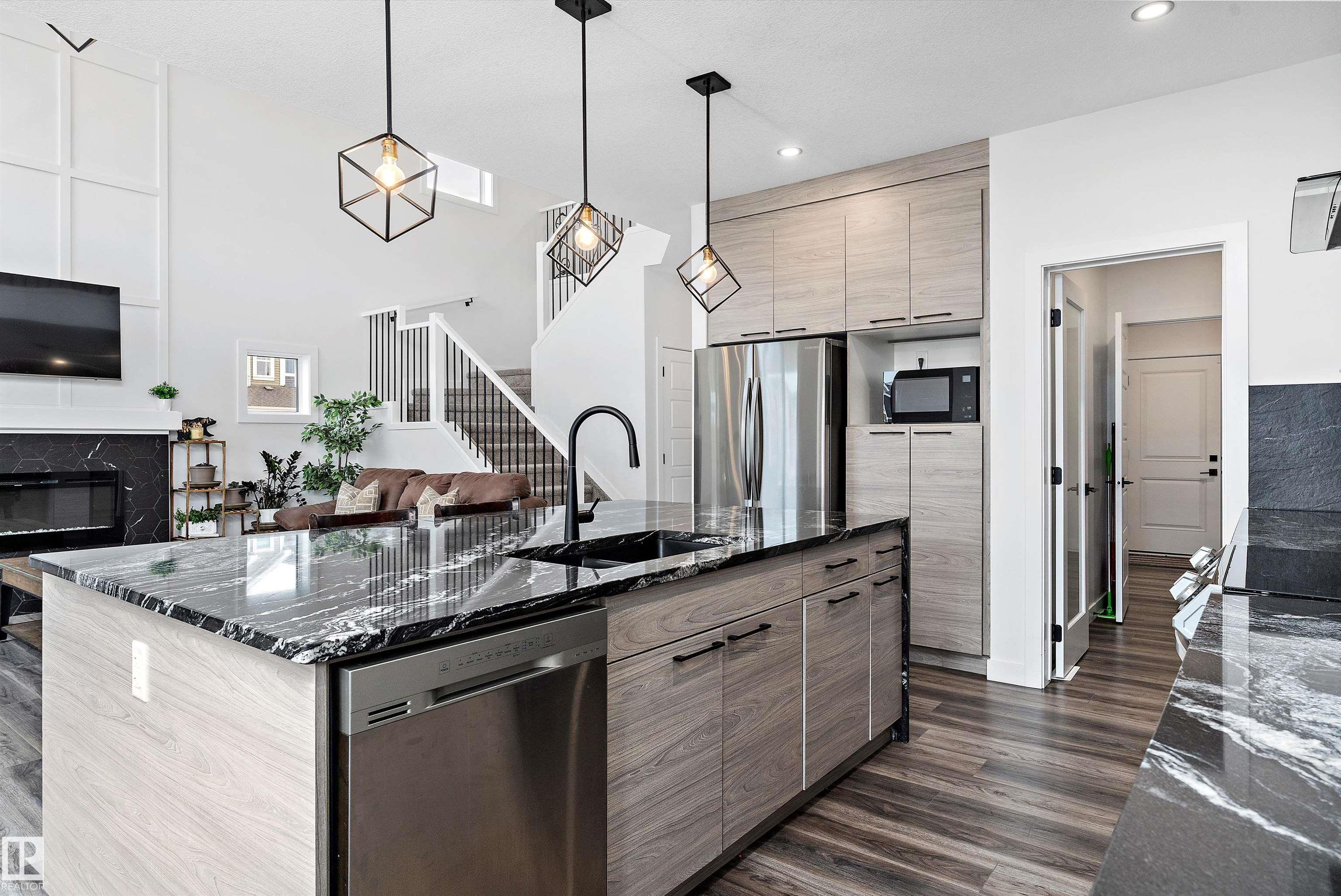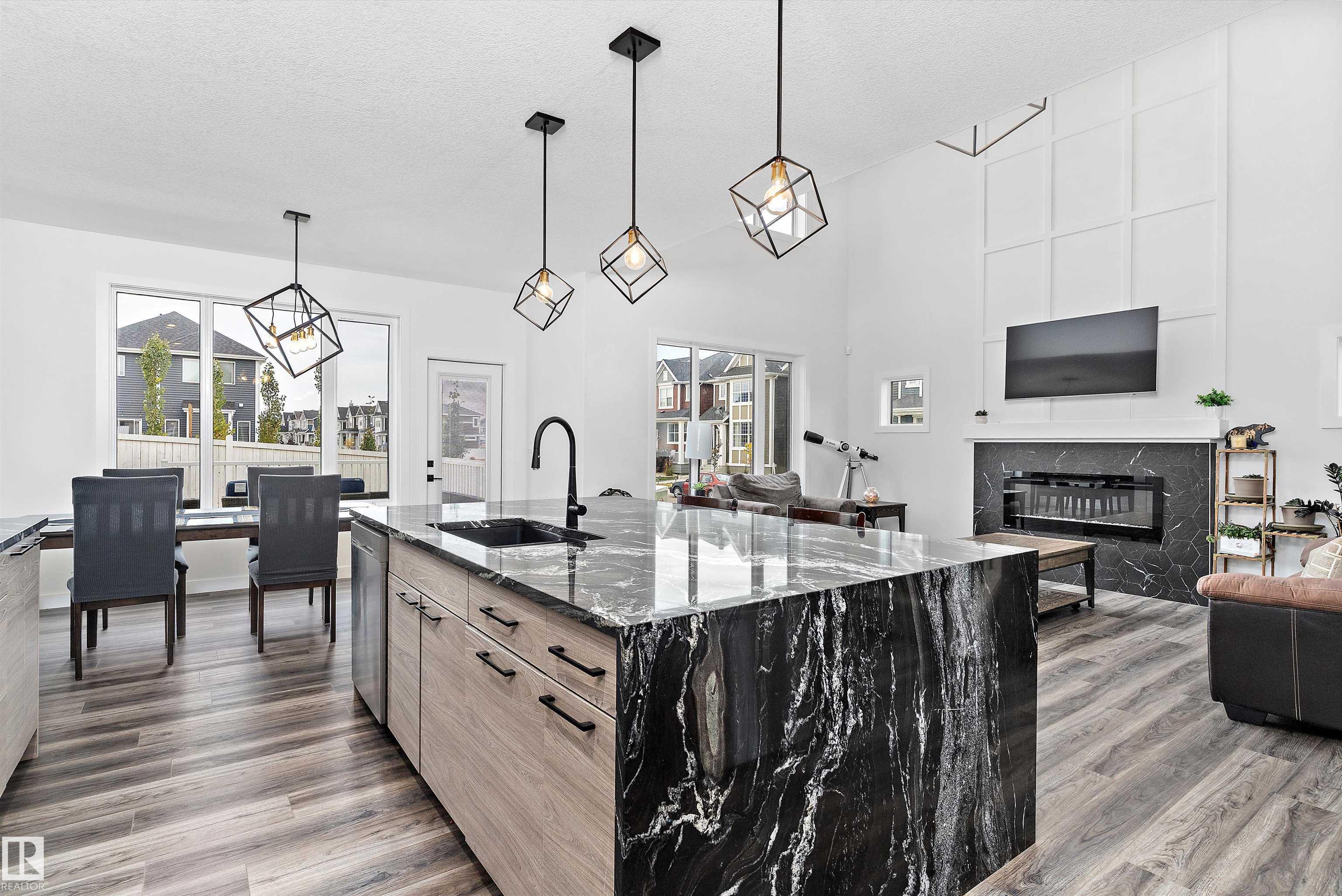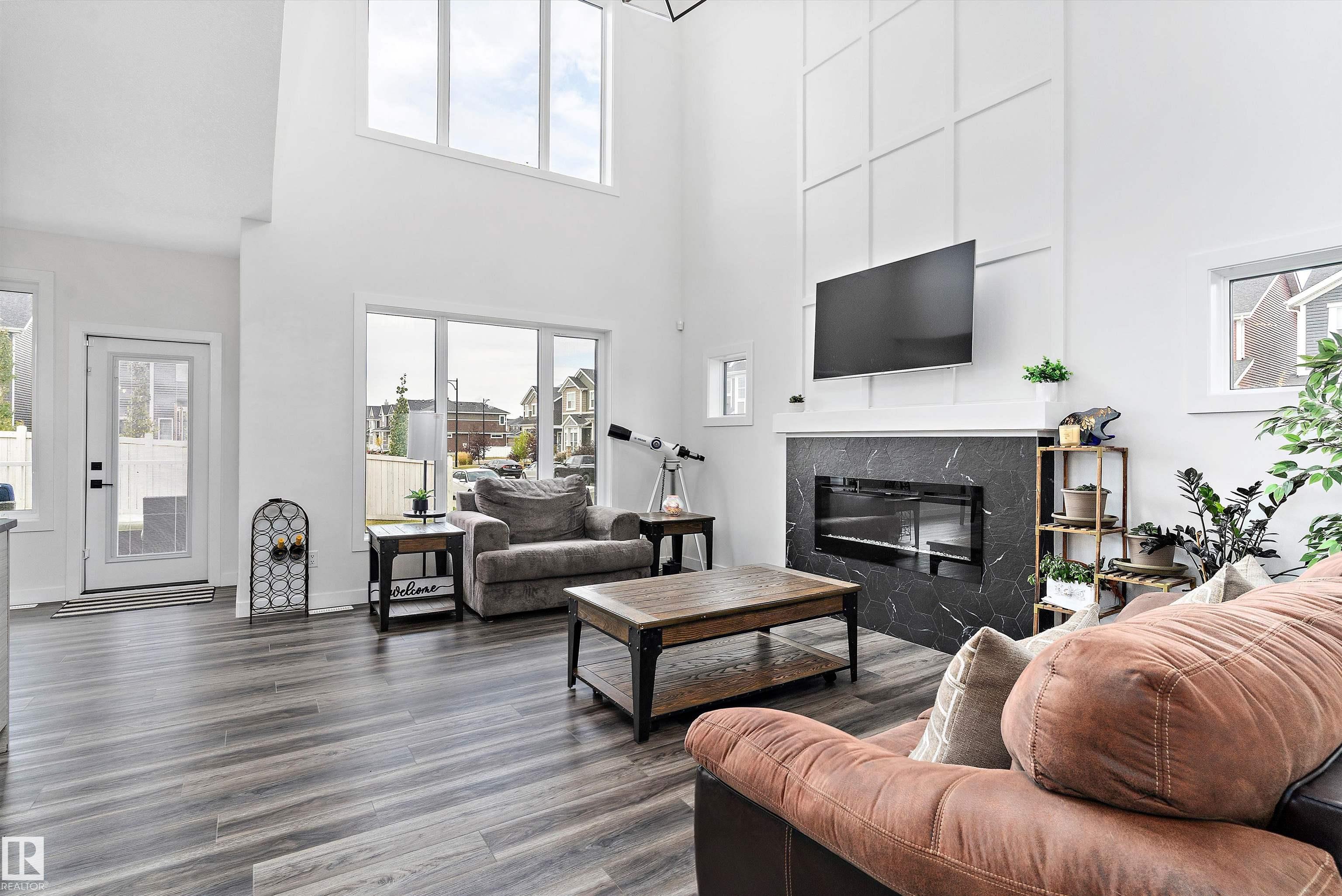Welcome Home to Southfork! Built in 2022, this 2,246 sq ft two-storey showcases modern design, quality craftsmanship, and upgrades throughout. Step inside to an open-concept living area with a feature wall, tiled surround electric fireplace with mantel, soaring 20' ceilings, and expansive west-facing windows that flood the home with natural light. The kitchen has premium cabinetry, a large waterfall granite island, stainless steel appliances, and a walk-through pantry. Also on the main floor, den, stylish half bath, and mudroom with built-in bench and shelving. Upstairs, retreat to the luxurious primary suite with tray ceiling, a spa-like 5-piece ensuite with dual sinks, soaker tub, floor-to-ceiling tiled shower, plus a spacious walk-in closet. The upper floor also features a bright bonus room, two additional bedrooms, a 4-piece bathroom, and a dedicated laundry room with sink. Additional highlights include:Side entrance with suite potential in the basement, oversized deep garage, rear deck, central A/C.