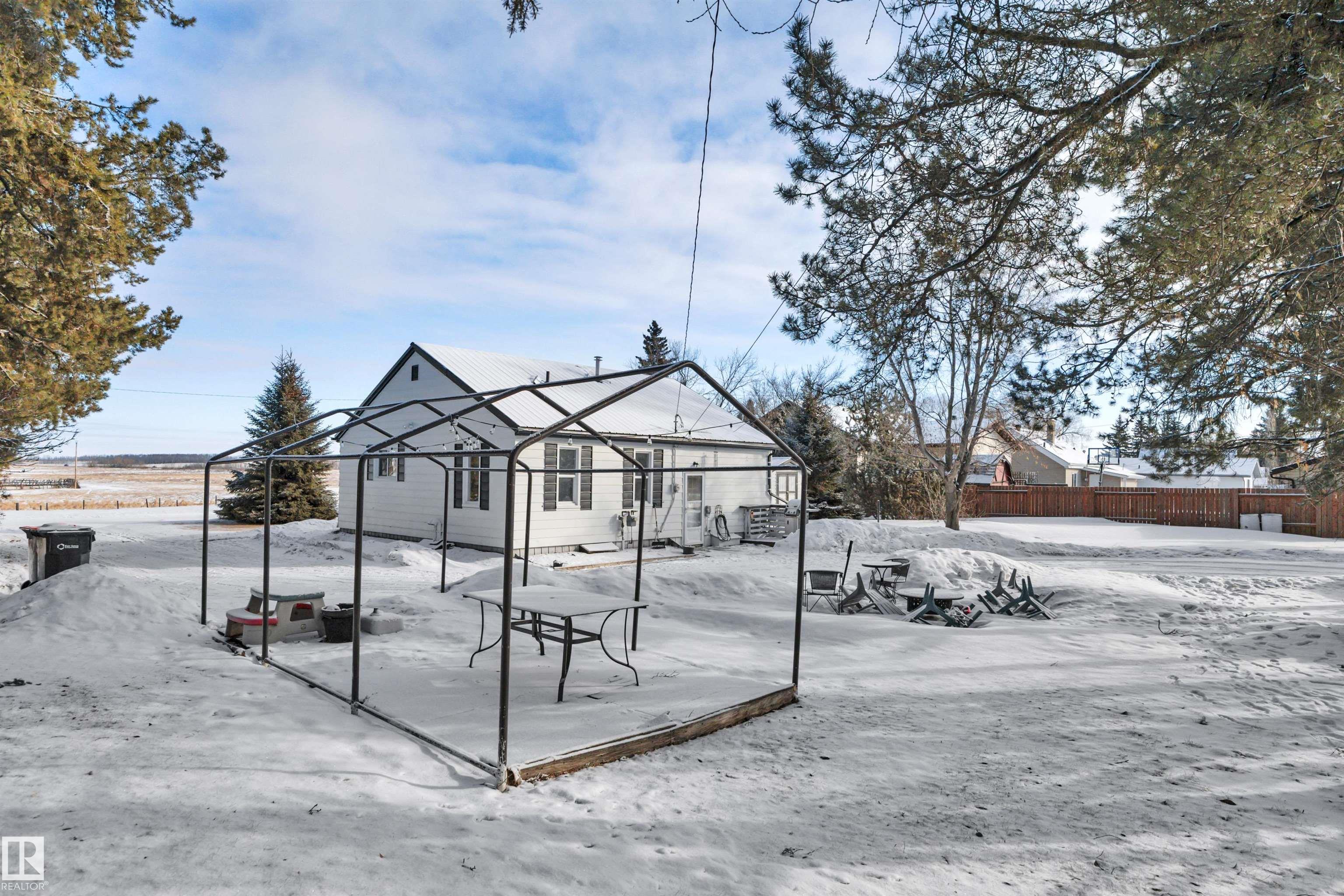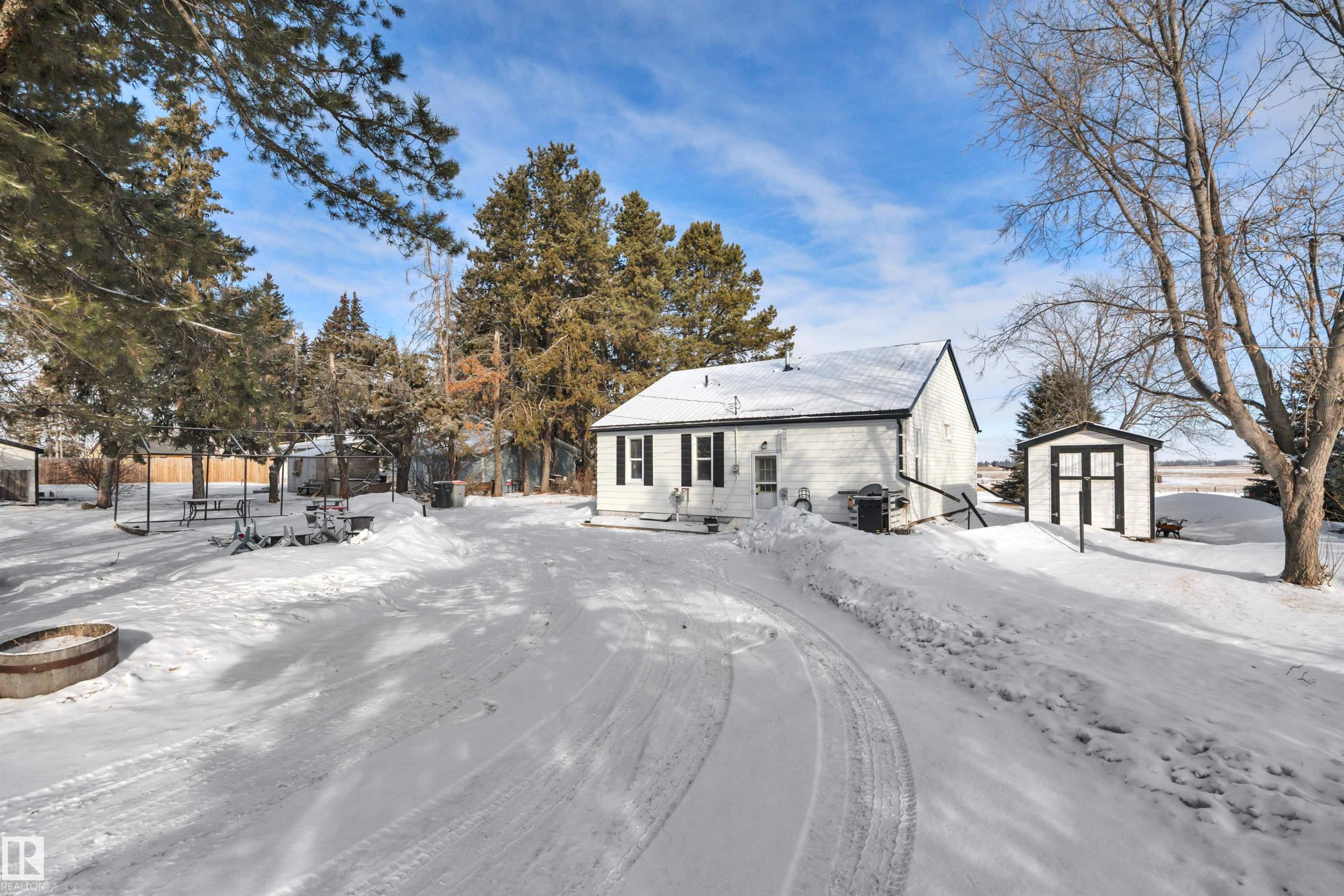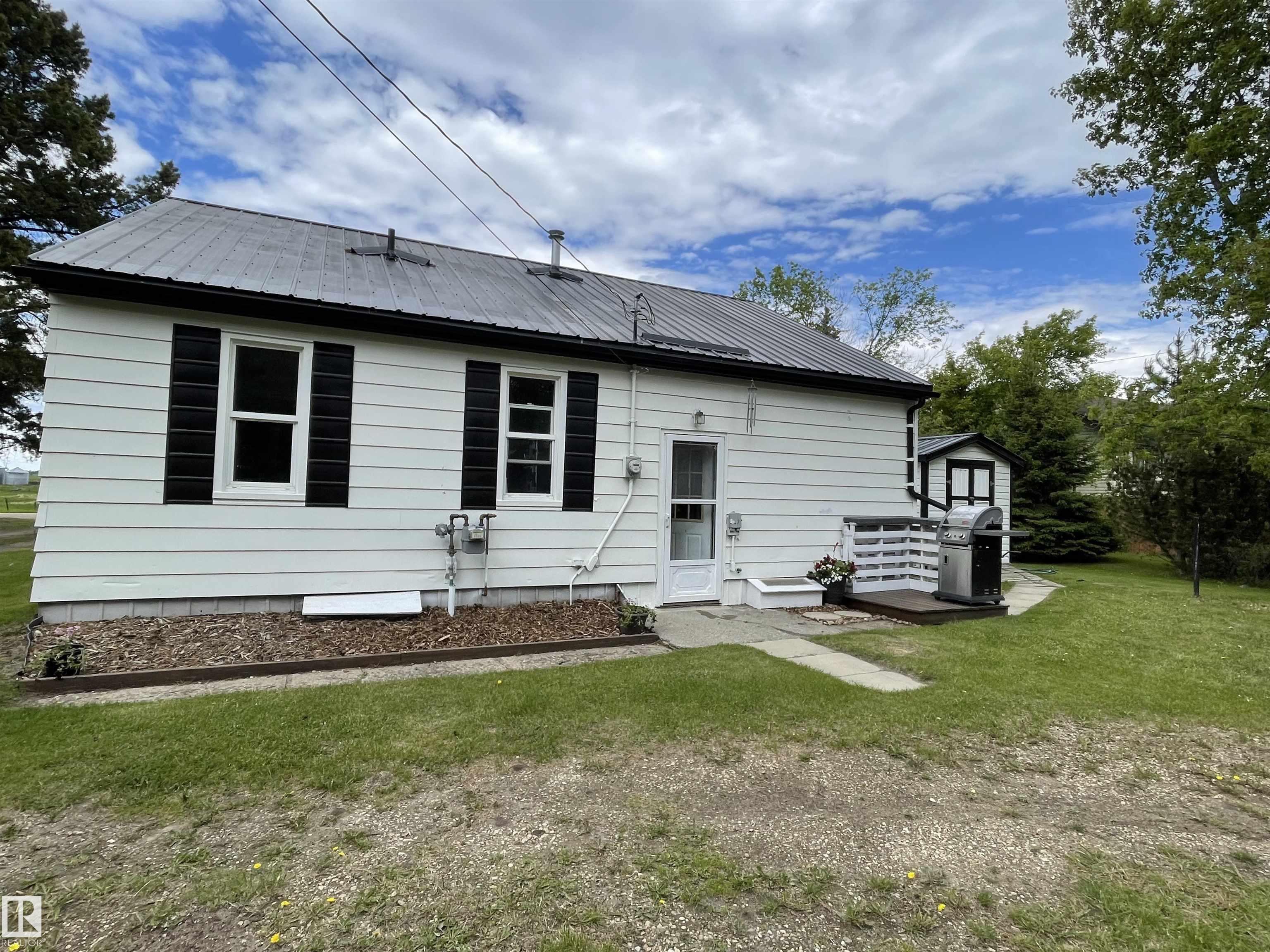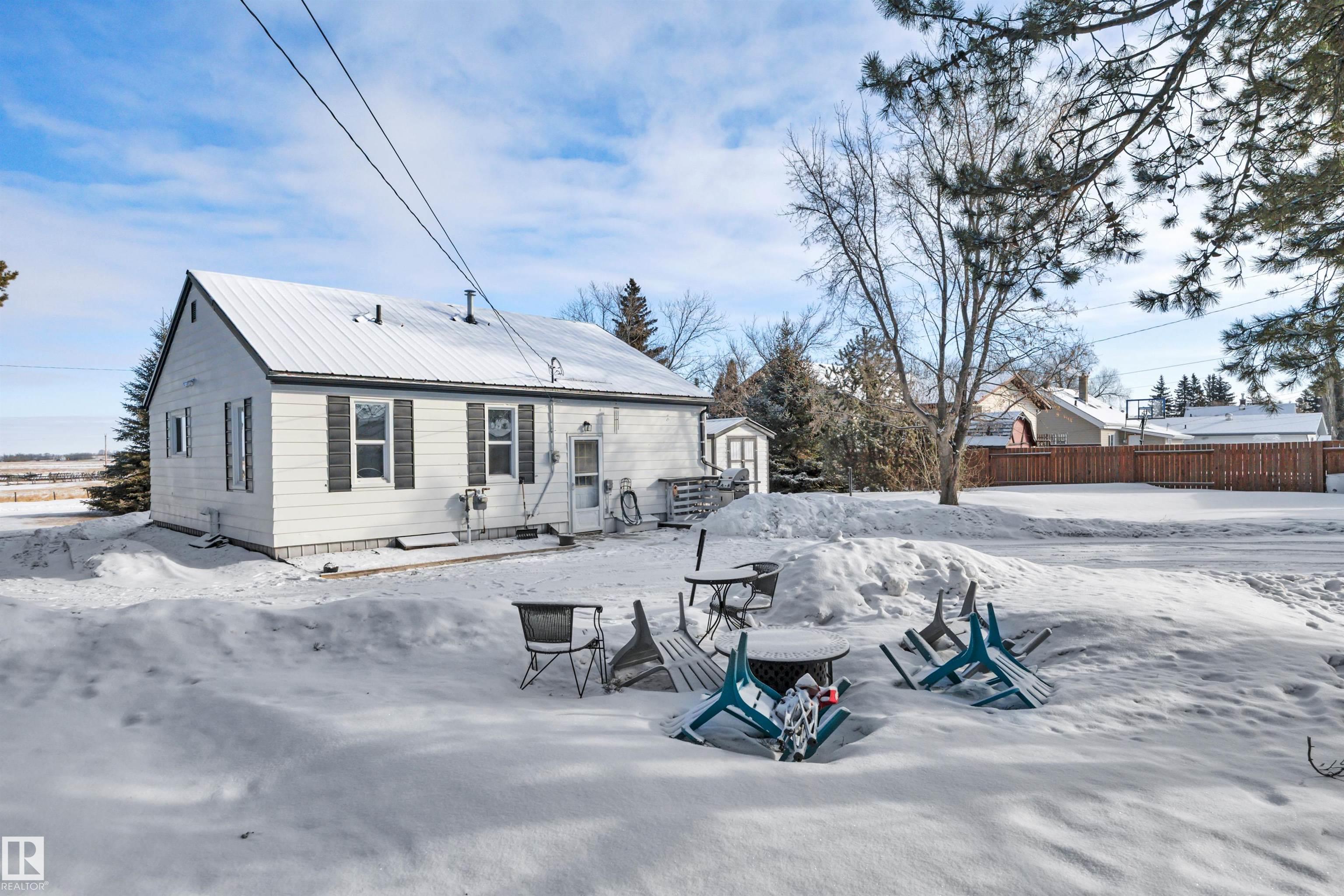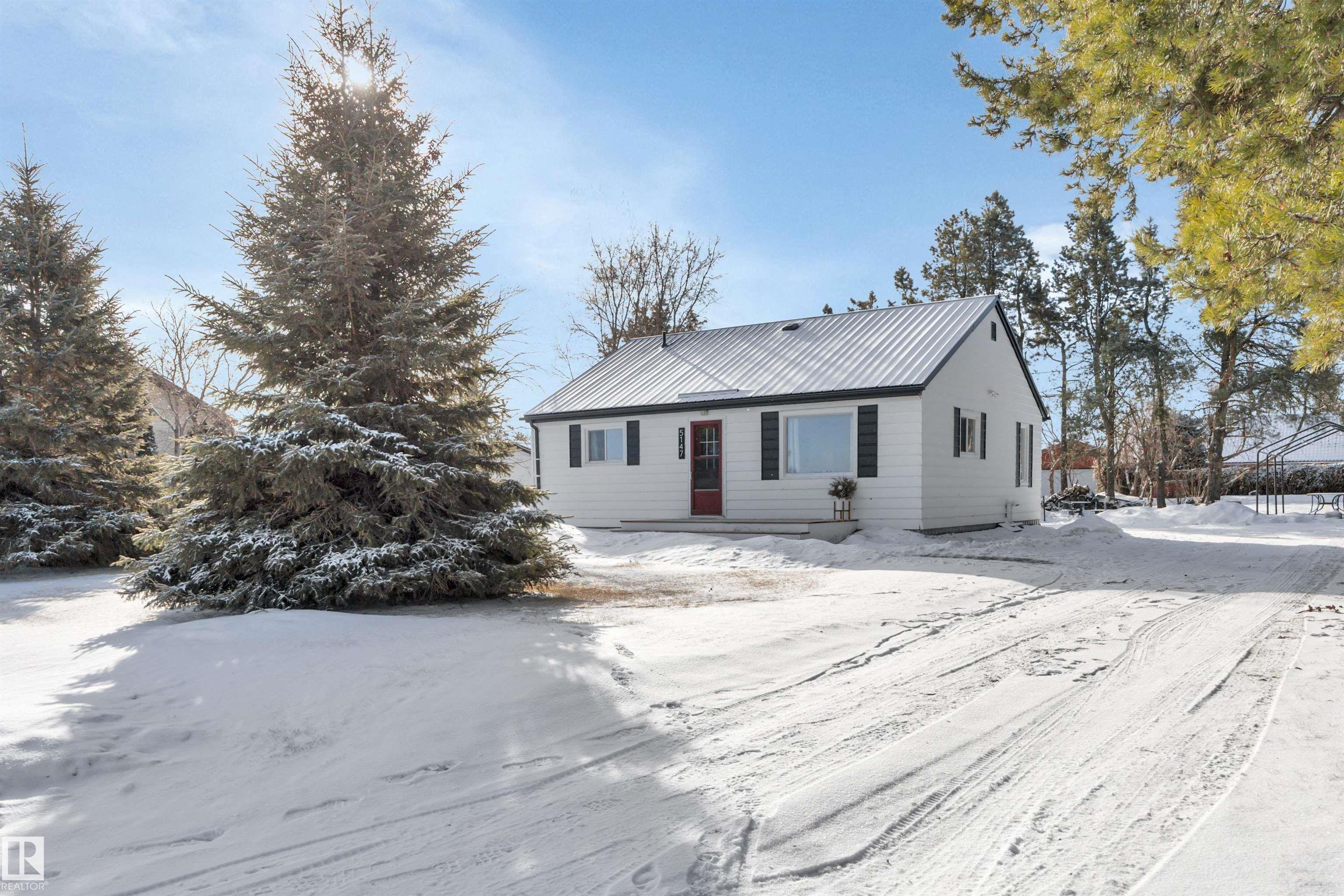 CUTE AS A BUTTON! 125' x 125' FOOT LOT! Searching for a well maintained character home with pinterest worthy updates? Massive yard to add your dream garage or workshop? Buy and hold for future development? This 893 sq ft 2 bed, 1 bath shows exceptionally well & unites modern touches with farmhouse vibes! Feat: renovated bathroom, refreshed kitchen, paint, laminate flooring, plush carpet, vinyl windows, tin roof, painted siding, newer front porch, newer hot water tank, & more! Classic separated main floor plan w/ large living room & window for ample natural light. Cozy dining room, galley style kitchen w/ gas stove, subway tile backsplash & laminate countertop. 2 spacious bedrooms, gorgeous 4 pce bathroom & storage. The basement is unfinished, but home to laundry & storage, & room for additional bedroom / rec room & bath! Rear lane access with amazing DOUBLE LOT! RV parking, and tree lined for your garden, summer BBQs and bonfires. Steps to groceries & 2A; pastures views from the porch. A must see!